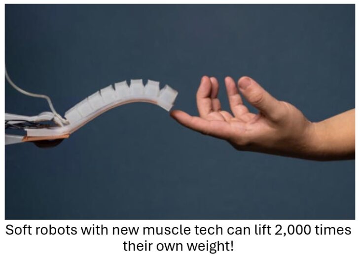 Many modern robots, especially those designed for industrial use, can lift far more than twice their own body weight. Our science and technology news reporter Ralph Bond tells us there’s a new artificial muscle technology designed specifically for “soft” robots that will boost their lifting ability to an astonishing new level.